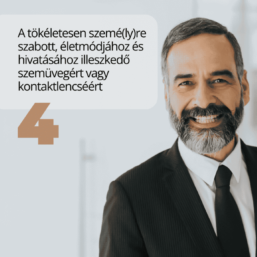 Ebben az életkorban kiemelten fontossá válik, hogy egyetlen segédeszközzel élesen láthassunk mind távolra, mind közelre, mind közép- vagy monitortávolságra, mert nem szeretnénk állandóan váltogatni és keresgélni a különböző távolságokra élesen látó szemüvegeinket. Ehhez viszont már személyre szabott multifokális vagy progresszív lencsék felírására és beállítására van szükség.